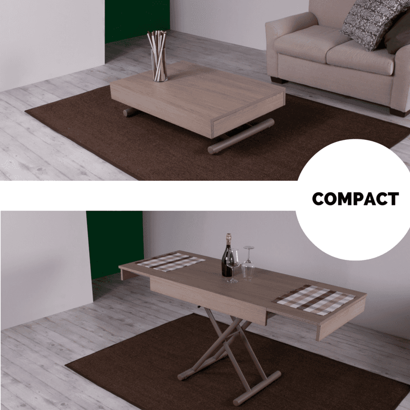Tavolino trasformabile in tavolo da pranzo oppure in letto, base in metallo, meccanismo a gas, regolabile in altezza al millimetro da cm 25 a cm 75, piano rettangolare in nobilitato, legno o effetto malta. Ruote a scomparsa. Dotato di pouff trasformabile in materasso (schiuma poliuretano ignifugo D 35), rivestito in tessuto beige o grigio. Rete a doghe e pannello in legno multistrato. Gambe pieghevoli di supporto.